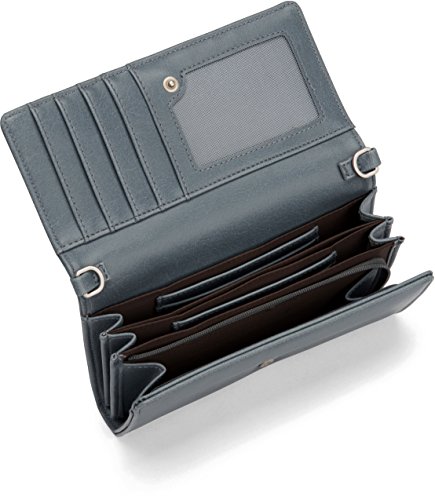 Bifold accordion wallet with front flap snap closure. Can be worn crossbody with removable and fixed length strap. INTERIOR: 11 card slots, 2 bill compartments, 2 compartments with interior divider, zipper coin pocket.