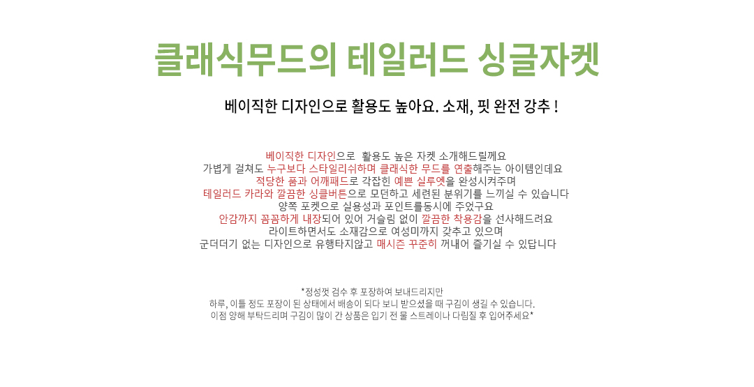 | 소재(Material) | 폴리(polyester/)100%안감폴리(polyester/)100% | |