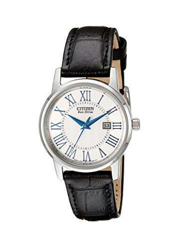 -. Feature : インポート品 海外輸入品 import product / The pinnacle of sophistication, this eternally elegant design from Citizen Women's boasts beautiful blue Roman numerals, markers, and hands nestled on a crisp silver dial for a polished, precise presence. / Japanese quartz movement with analog display / Protective mineral crystal dial window / Features include Eco-drive is fueled by light so it never needs a battery, black leather strap, silver tone stainless steel case