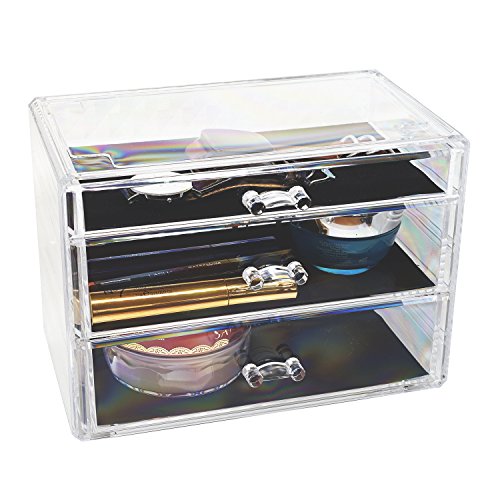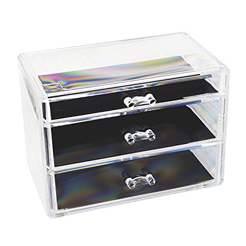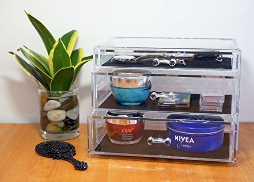 d'Moda Designs Crystal Clear Acrylic, Deluxe Deep Drawer Makeup and Jewelry Organizer; 3 Large Storage Drawers for Lipstick, Brushes, Nail Polish, Compacts and Cosmetics