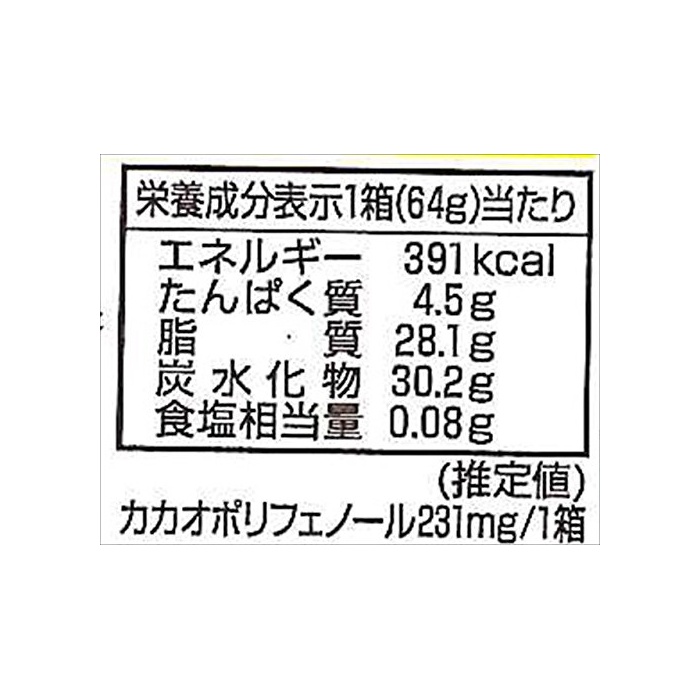 원재료:설탕,《마카다미아낫츠》,전분유,카카오 마스,식물성 기름지,코코아 버터,유당,크리밍 파우더,유화 제(대두를 포함한다)고, 향료