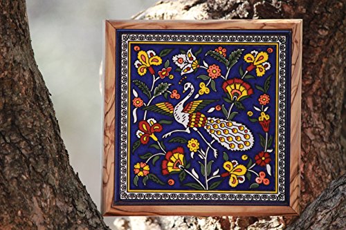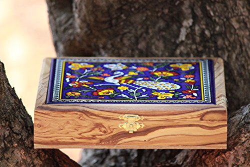 Aelia Olive Wood Ceramic Jewelry Box Lockable Storage Case (Peacock) Manufactured In Jerusalem