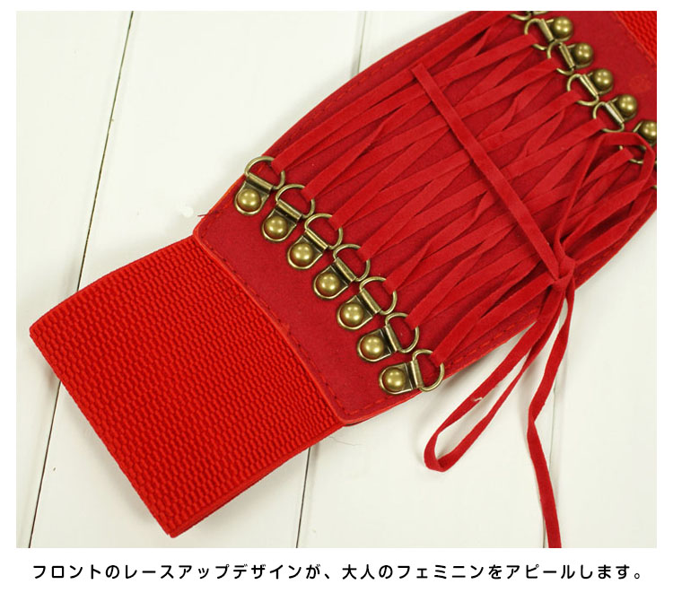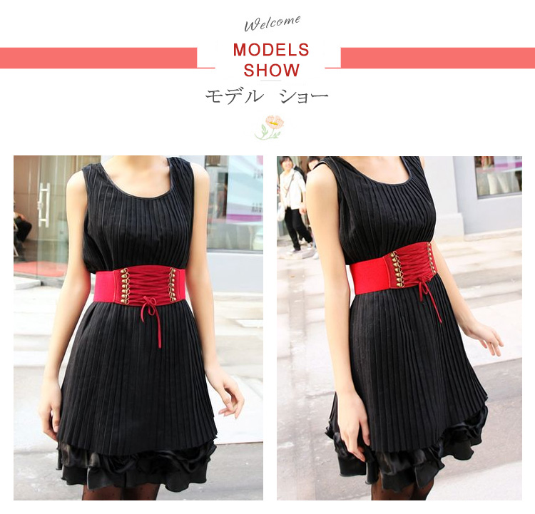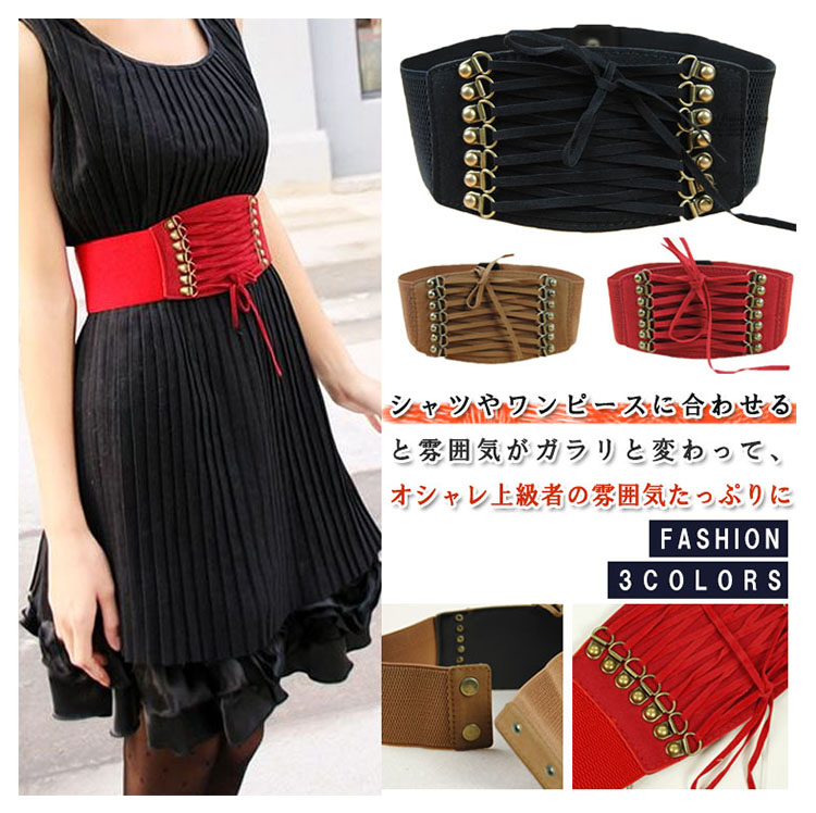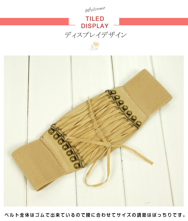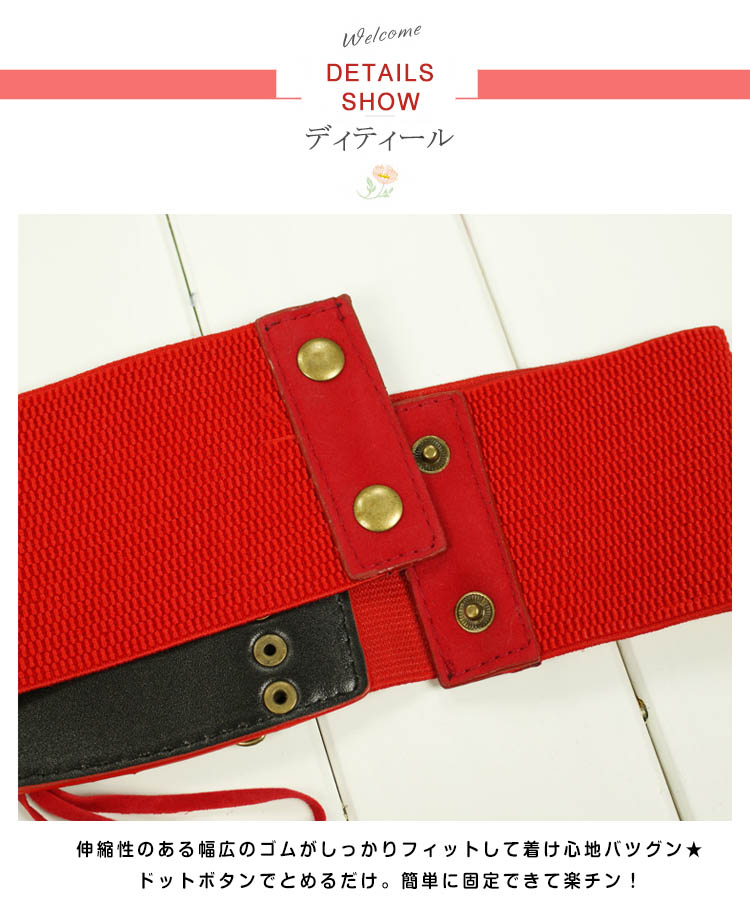 | シャツやワンピースに合わせると雰囲気がガラリと変わって、オシャレ上級者の雰囲気たっぷりに。ベルト全体はゴムで出来ているので腰に合わせてサイズの調節はばっちりです。ワンピースの上から着ければ美ライン効果もゲット!! | |