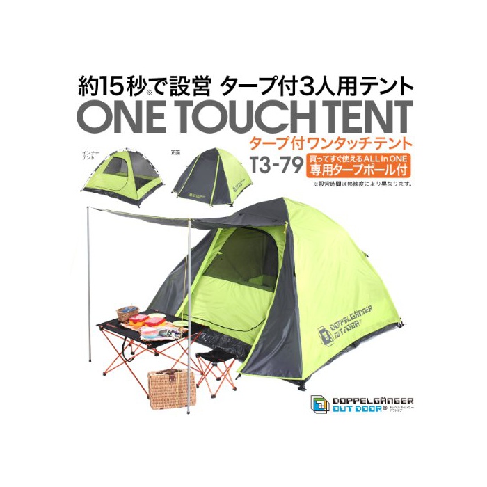 DOPPELGANGER OUTDOOR 2-3명 용 원터치 텐트 T3-79 설치 간단 타프 기능으로 쾌적 공간【전용 폴 부착】