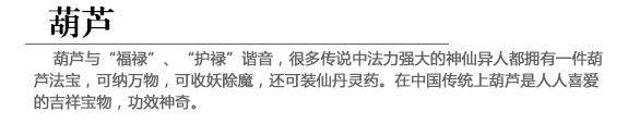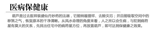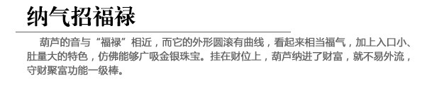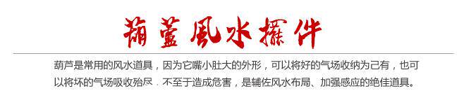 葫芦是常用的风水道具,因为它嘴小肚大的外形,可以将好的气场收纳为己有,也可以将坏的气场吸收殆尽,不至于造成危害,是辅佐风水布局、加强感应的绝佳道具。