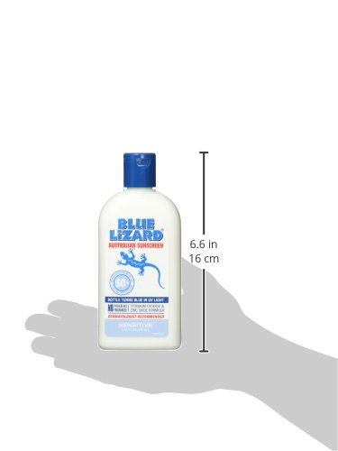 Blue Lizard Australian Sunscreen Sensitive 8.75 oz uses only high quality natural minerals, Zinc Oxide and Titanium Dioxide, for broad spectrum UVA and UVB skin protection. Dermatologist-recommended and specially formulated for everyday protection on face and body, involving no potentially irritating chemicals, Blue Lizard Australian Sensitive Sunscreen is effective UV protection but gentle on sensitive skin. Sunscreen features: SPF 30+, Broad Spectrum UVA/UVB, Chemical-Free, Paraben-Free, Fragrance-Free, 10% Zinc Oxide; 5% Titanium Dioxide. Blue Lizard Australian Sensitive Sunscreen’s patented BPA-free 8.75 oz Smart Bottle turns blue in the presence of harmful UV rays, reminding you to cover up. The deeper blue the bottle becomes, the more UV rays are currently present. Keep in mind that larger packaging, like 8.75 oz bottles and gallons, are cheaper per ounce.Feature