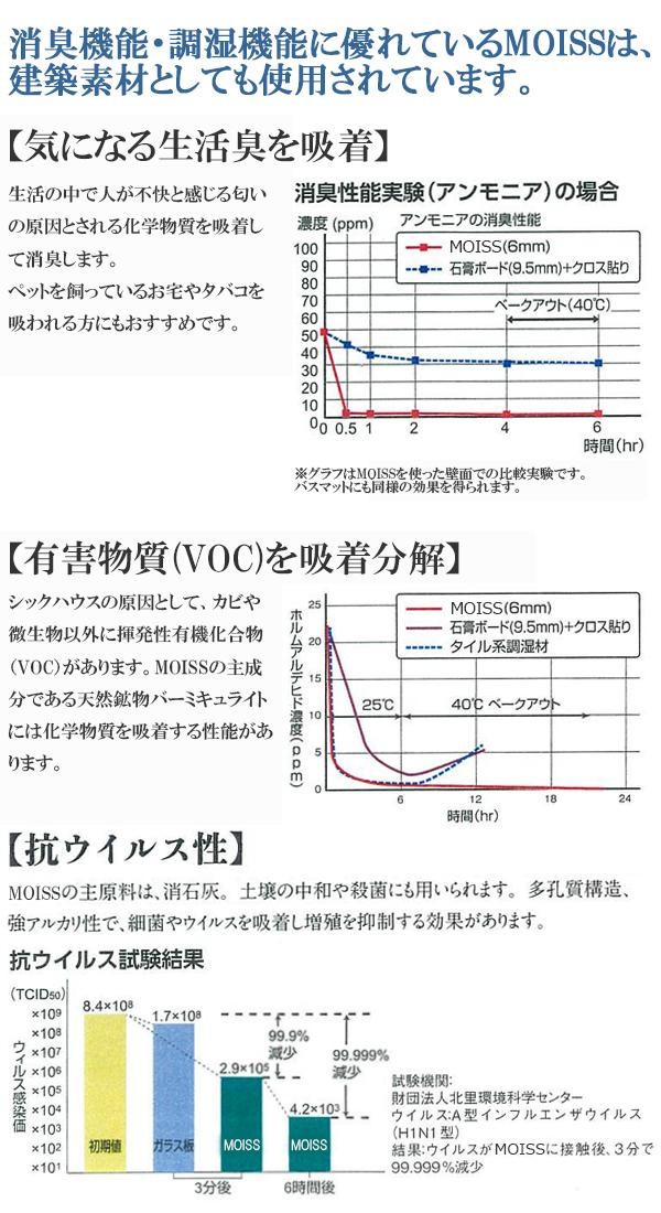 MOISS(モイス)を使用した、珪藻土バスマットです。化学物質は一切含んでいないため、お子さまにも安心です。表面に無数の小さな孔が空いているため、付着した水をすぐに吸収してサラサラの状態を保ちます。カビ菌やダニが増殖しにくく、日々のお手入れも簡単です。 |