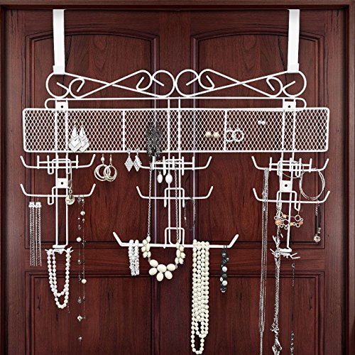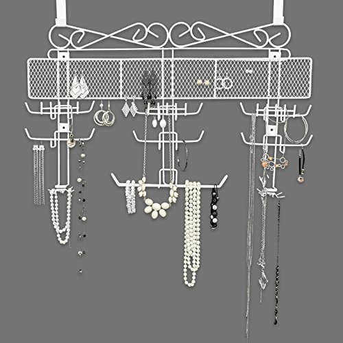 -. Feature : BEAUTIFUL & ELEGANT JEWELRY VALET - Designed with white exterior paint coating- Keeps jewelry organized and tangle-free / CONSIST OF 10 varied sections; 1 top mesh storage sections, 7 hanging hook sections, and 2 bottom swivel hooks / IDEAL for necklaces, bracelets, watches, earrings, rings, brooches, and many other jewelry pieces - Show your jewelry off with style and elegance / PROTECT & SECURE jewelry from scratches and damage - Large capacity to hold a large amount of jewelry and diversified compartments for a variety of accessories / INCLUDES over the door hooks to be hung on closet door & wall screws to be directly mounted to the walls -Measures approximately 11.75" L x 2.5" W x 14.25" H