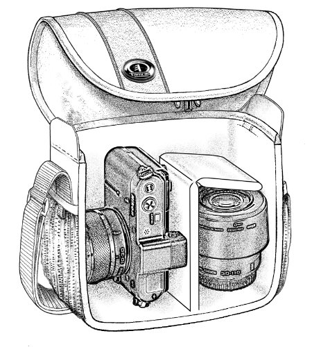 Lightweight, compact bag holds a mirrorless camera with lens attached, an extra lens, a small flash and accessories