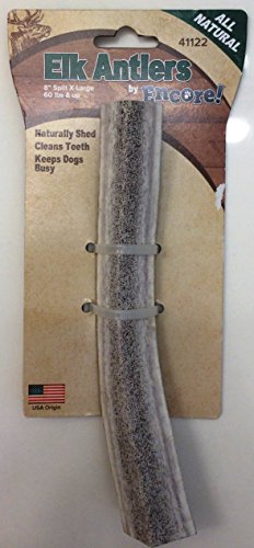 -. Binding : Misc. -. Brand : Encore -. EAN : 0084153411227 -. Feature : Helps clean teeth while aiding in tartar and plaque build-up / Good source of protein and low in fat / Marrow is nutrient-rich and appetizing / Naturally free of odors, dyes and preservatives / Ideal for large dogs 60 lbs & up -. Label : Encore -. Manufacturer : Encore -. PackageQuantity : 1 -. ProductGroup : Pet Products -. ProductTypeName : PET_SUPPLIES -. Publisher : Encore -. Studio : Encore -. Title : 8" split X-Large Elk Antler -. UPC : 084153411227