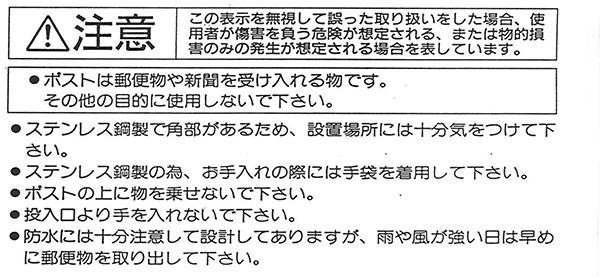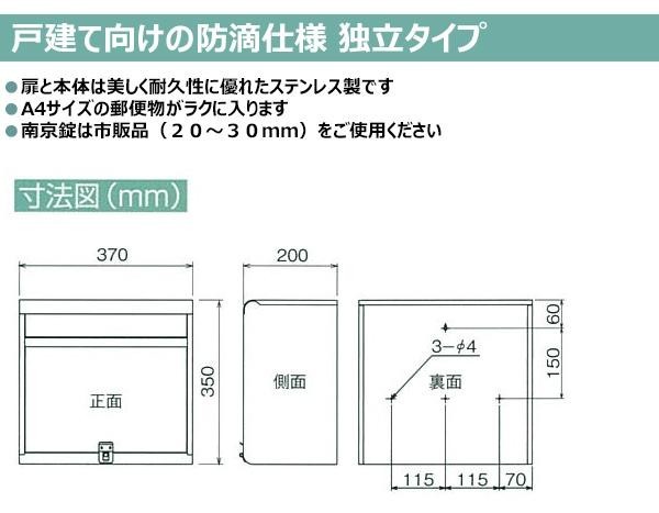 扉と本体は耐久性に優れたステンレス製です。A4サイズの郵便物がラクに入ります。 |