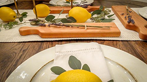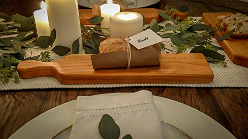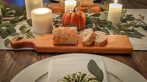 The Kitchen Board uses Cheery Wood which is extremely durable. The dimensions are 15” (Length) x 3 ½” (Width) x ¾” (Height). The ideal dimensions for a Cheese Platter or Display Plate.