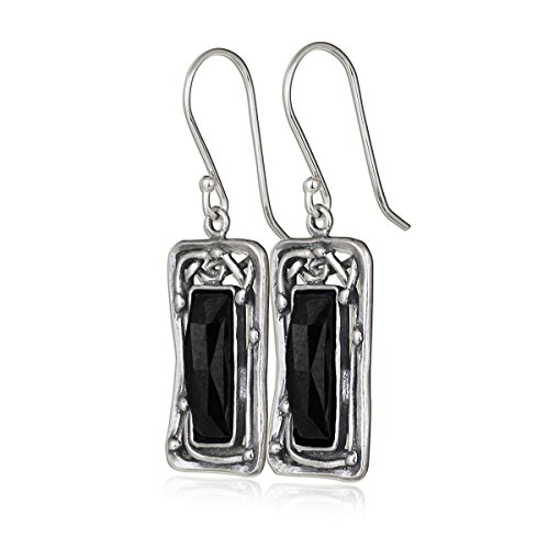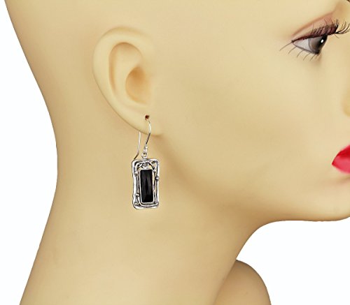Ornate rectangle shaped Silver and black Onyx gemstone earrings. 925 Sterling Silver and black Onyx dangle earrings. A 5 x 15 mm rose-cut rectangular black Onyx is set in this textured Sterling Silver rectangle shaped earring. The Silver rectangle measures about 1/2" wide by 1" long. The gemstone is adorned with an intricate ornate design. Unique artisan design.
