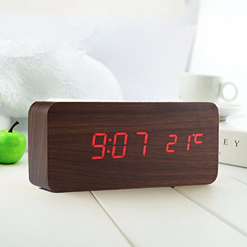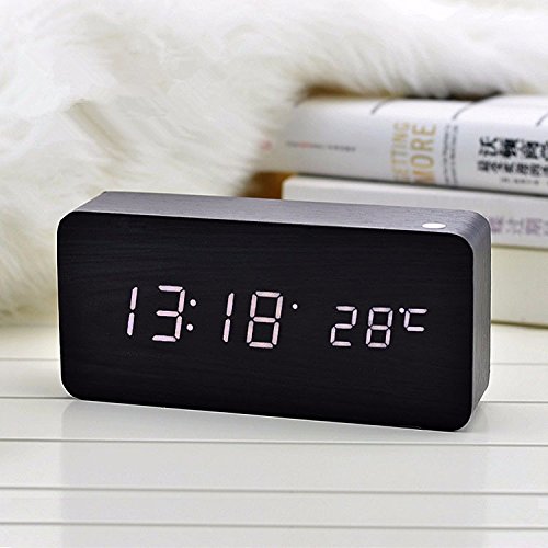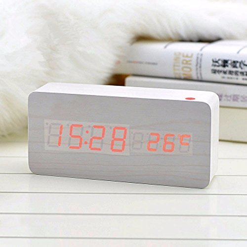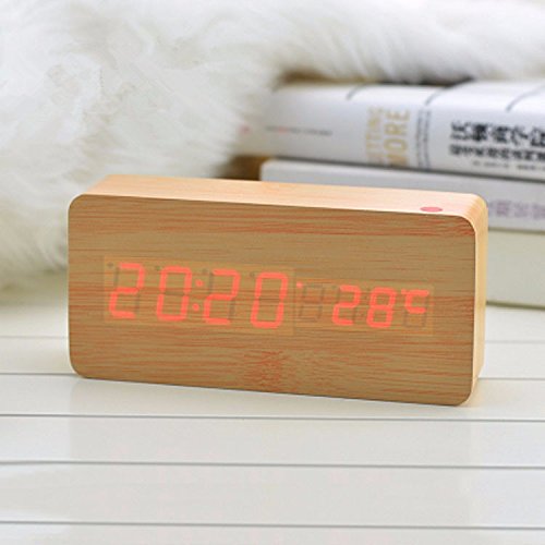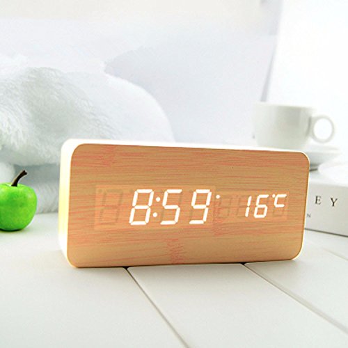 shouldbuy Shouldbuy White LED Bamboo Wooden Board Alarm Clock+temperature Thermometer Digital Table Clock Voice Activated Battery Usb Power Despertador