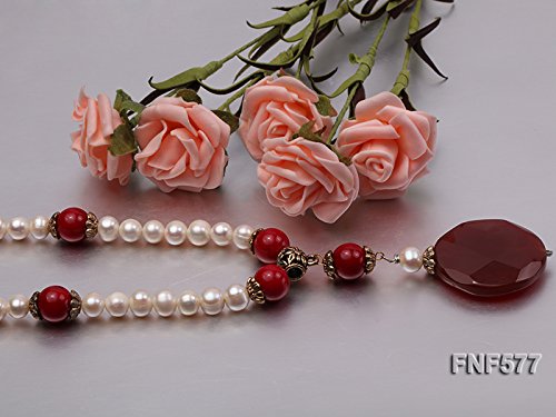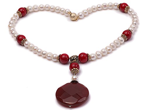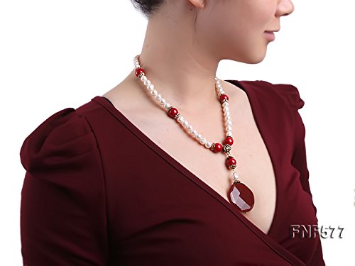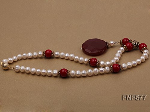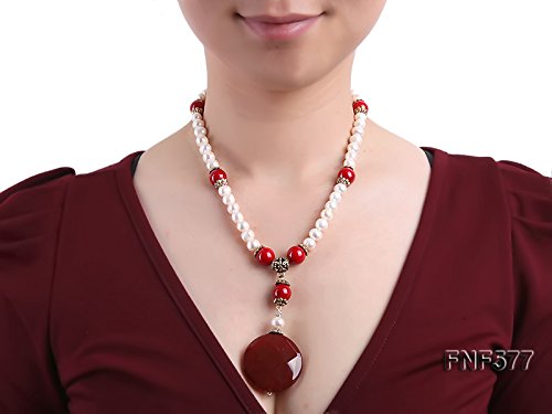 Description *This is a very beautiful classic necklace, set with 8-9mm white cultured freshwater pearls, 12mm red coral beads and a red disc-shaped agate pendant.