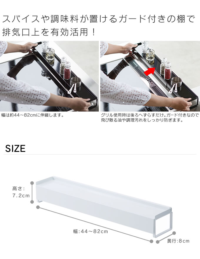 | ポイント | スパイスや調味料などを置けるガード付きの棚で排気口上を有効活用! グリル使用時は後ろへずらすだけ |
