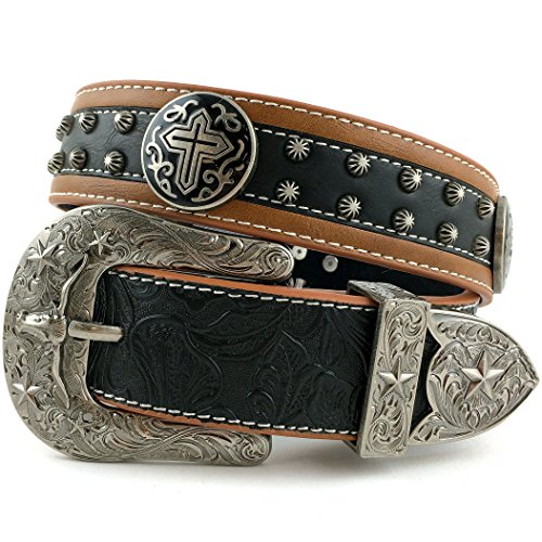 -. Title : Western Peak Men's Tooled Genuine Leather Round Cross Concho Embossed Buckle Belt