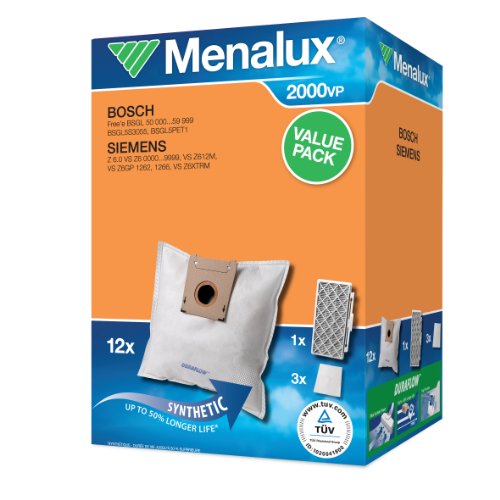 Original Markenware Menalux 2000VP, Vorteilspack fur Bosch BSGL5 und Siemens VSZ6, 12x Staubsaugerbeutel, 1x Hygiene Filter H12, 3x Microfilter