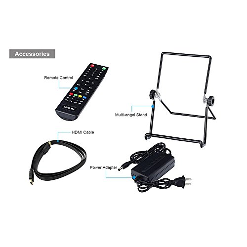 -. Feature : Resolution: 1024x600, up to 1080p / Panel Size: 10.1 inches / Aspect ratio: 16: 9 (width: height) / Display area: 222.52 x 125.11mm / You will get:10.1 inch HD display x 1, Power adapter x 1, HDMI cable x 1, Multi- angle stand x 1 , Infrared controller x 1, User manual x 1