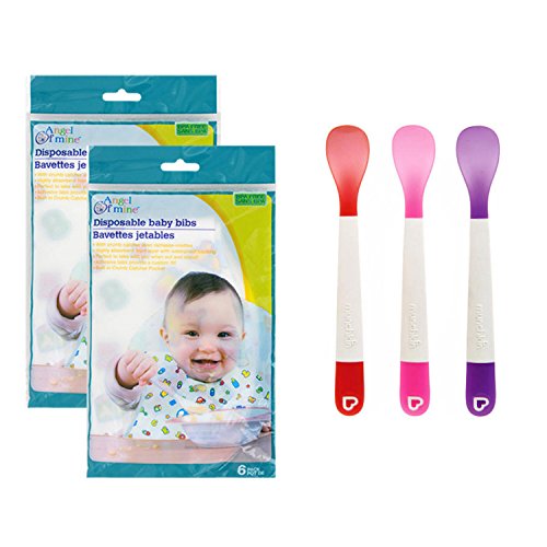 -. Binding : Baby Product -. Brand : Unknown -. Color : Black - Mickey Mouse Utensils -. Feature : Disposable bibs have absorbent top layer and waterproof backing to protect baby while eating / Adhesive tabs allow for custom fit and crumb catcher catches helps with disposable cleanup / Munchkin Baby spoons in fun colors designed for easy feeding / Spoons have a base to keep spoon bowl lifted off of surface to keep away from germs / Resealable bib packaging lets you store utensils in the package for eating one the go -. IsAdultProduct : 0 -. Label : Mixed Brands -. Manufacturer : Mixed Brands -. MPN : 1 -. PackageQuantity : 3 -. PartNumber : 1 -. ProductGroup : Baby Product -. ProductTypeName : BABY_PRODUCT -. Publisher : Mixed Brands -. Studio : Mixed Brands -. Title : Disposable Baby Bibs (12) and 3 Baby Spoons