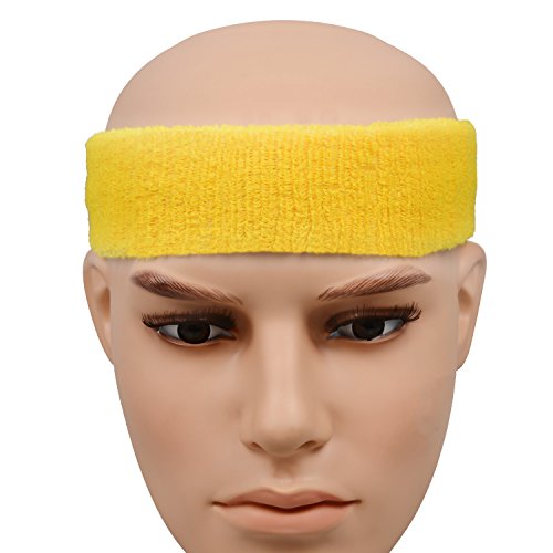 -. Feature : Headbands in assorted colors ( black, white, blue, red, orange, yellow, green, hot pink, light blue, purple) / Durable, comfortable and washable / New thicker version, absorb sweat effectively / Great for basketball, yoga, soccer and other sports / Size:7"(L) x 2''(W) ; Materials: 65% cotton / 30% nylon / 5% lycra