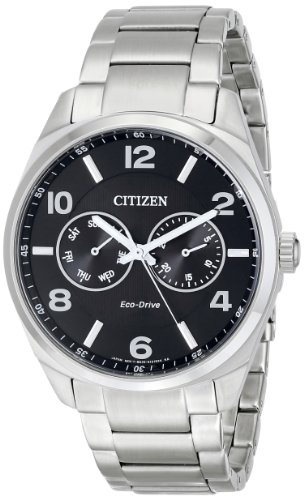 -. Binding : Watch -. Brand : Citizen -. Color : Silver Tone Stainless Steel -. Department : mens -. EAN : 0013205105241 -. Feature : Dress watch in stainless steel with textured vertical stripes on inner dial and three-link bracelet / Japanese quartz movement with analog display / Eco-drive is fueled by light so it never needs a battery / Features protective mineral crystal dial window, dual chronograph day and date subdials, and fold-over clasp closure / Water resistant to 99 feet (30 M): withstands rain and splashes of water, but not showering or submersion -. Label : Citizen -. Manufacturer : Citizen -. Model : AO9020-84E -. MPN : AO9020-84E -. PackageQuantity : 1 -. PartNumber : AO9020-84E -. ProductGroup : Watch -. ProductTypeName : WATCH -. Publisher : Citizen -. ReleaseDate : 2014-01-03 -. Size : Standard -. Studio : Citizen -. Title : Citizen Men's AO9020-84E Stainless Steel Dress Watch -. UPC : 013205105241