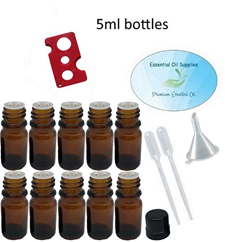 5ml (1/6 Ounce) Amber Glass Bottles with Euro Orifice Reducer Tops (Pack of 10), Funnel, Pipettes, and Essential Oil Bottle Opener