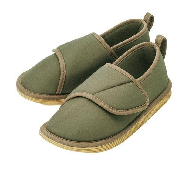 | かかとのあるシューズ型なので、スリッパのように脱げて転倒することを予防します。甲の部分は面ファスナーで調整できるので、足にフィットします。また着脱が容易です。底面は滑りにくい素材と3箇所に滑り止めを付けて、スリップを予防します。歩行中、床に引っかからないように、爪先の底を斜めにカットしています。 |
