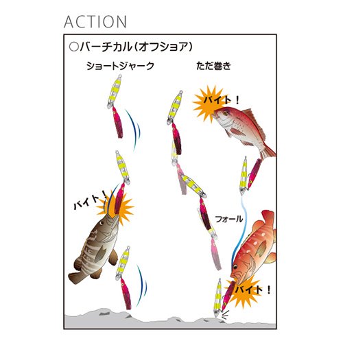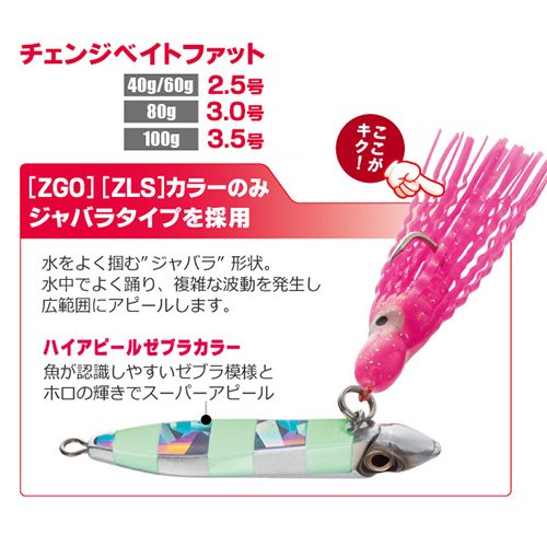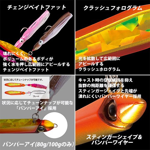 NEW SIZE 80g/100g에는 신색크래쉬 홀로그램 골드 레드를 추가!! ●라이트 지깅이나《쇼아지긴구》에 최적!■불의의 거물에게도 안심!hiker 본 스틸의「부시리침(13호)」●빛을 확산해 광범위하게 어필한다「크래쉬 홀로그램」●높은《스낫구레스》성과 낚시찌 수확을 억제해 롤링 액션을 일으킨다「스트림 슬림 헤드」●각종 훅에 널리 대응한다「싸이드 아이」●공기 저항을 억제해 비거리를 확보한다「Stinger(스팅어) 셰이프」●첨단이 붕괴되어 어려운「범퍼 와이어」채용●망가지기 어려워 볼륨이 있는 바디가 강하게 수를 누르기 광범위하게 어필「체인지 베이트 FAT2.5호」●대상어:참돔 시 버스(sea berth) 록 피쉬 넙치etc..