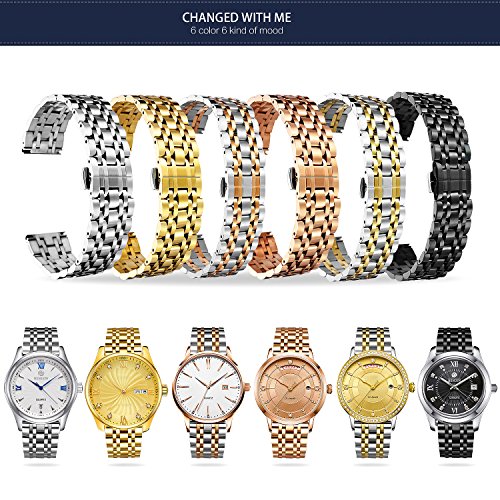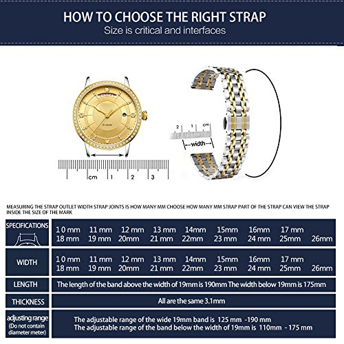 Brand, Seller, or Collection Name:BINLUN Model number:BL0001B-SG17 Part Number:BL0001B-SG17 Model Year:2018 Clasp:Fold-over-clasp-with-double-push-button-safety Case diameter:36 Band Material:Gold-tone stainless steel Band length:Women's Standard Band width:17 millimeters Band Color:gold tone Item weight:2.40 Ounces