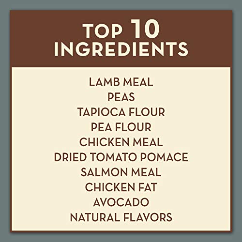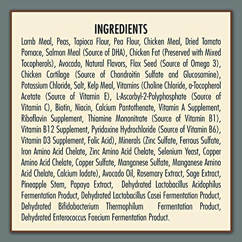 原材料:ラムミール、エンドウ豆、タピオカ粉、エンドウ粉、チキンミール、乾燥トマト、サーモンミール、アボカド、チキン脂肪、アルファルファミール、天然香料、チキン軟骨、亜麻仁、塩化カリウム、塩、ケルプ、ビタミン類(塩化コリン、アルファ酢酸トコフェロール、L-アスコルビン酸-2-ポリリン酸、ビオチン、ナイアシン、カルシウムパントテン酸塩、ビタミンA、、リボフラビン、チアミン硝酸塩、ビタミンB12、塩酸ビリドキシン、ビタミンD3、葉酸)、ミネラル類(硫酸亜鉛、硫酸鉄(II)、鉄アミノ酸キレート、亜鉛アミノ酸キレート、セレン酵母、銅アミノ酸キレート、硫酸銅、硫酸マンガン、マンガンアミノ酸キレート、カルシウムヨウ素酸塩)、アボカドオイル、ローズマリーエキス、セージエキス、パイナップル、パパイン、乾燥ラクトバチルスカゼイ発酵物、乾燥ビフィドバクテリウムテルモフィルム発酵物、乾燥エントロコッカスフェシウム発酵物
