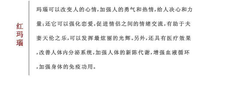 Agate can change people's feelings to strengthen people's courage and enthusiasm give a person the determination and strength; also it can strengthen the love between lovers to promote the emotional communication helps to couple the happiness of a family union can play the most dazzling brilliance. In addition but also has medical effect to improve the human endocrine system strengthen the body's The new supersedes the old. improve blood circulation strengthen the body's immune function. Agate is one of Buddhist Shippo since ancient times is as a talisman amulet use means that the friendly can help eliminate stressburnout decoration and other negative energy. Red agate can improve the internal circulation strengthen the blood flow let look good eliminate obstruction sex, prevent impotence and infertility partial orange red agateis on rectal gastrointestinal has good effect can be activated and visceralprevent constipation help discharge toxins have a soothing effect on liver disease rheumatism neuralgia varicose veins