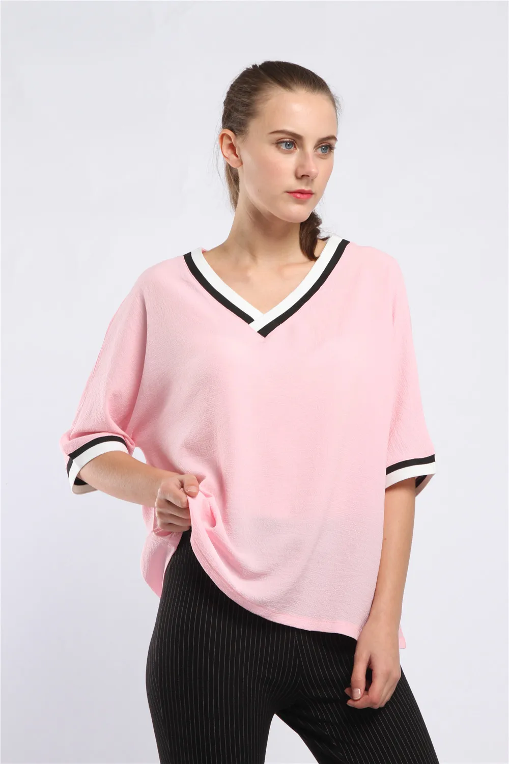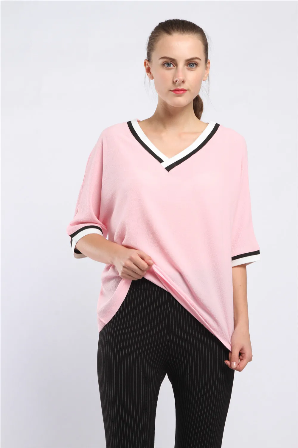 Women Blouse Fashion Solid V Neck Blouses Women's Summer Casual Chiffon Shirt Top Blusas Femininas Plus Size 4XL 5XL Pink/White