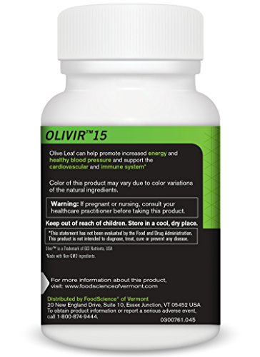 -. Feature : Olivir brand olive leaf extract is standardized to yield a minimum of 15% Oleuropein per capsule. Oleuropein supports the immune system response and aids in normal detoxification / Olivir 15 supports friendly microflora in the immune system and assists with natural detoxification. Each Tablet delivers 500 mg of Olive Leaf Extract / Olive Leaf Extract contains a natural complement of bioflavonoids from Quercetin and Rutin, which are powerful free-radical fighters / Olivir 15 is Gluten Free, Vegetarian and made from NON-GMO ingredients / All FoodScience of Vermont products are doctor formulated and approve by our physician review board