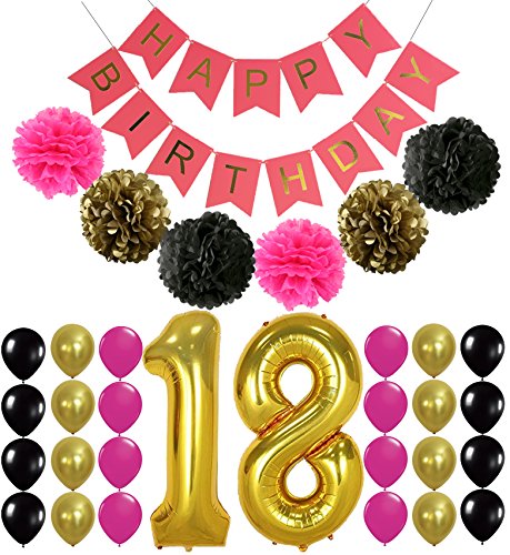 18th BIRTHDAY BANNER POMPOM DECORATIONS - Hot Pink Happy Birthday Banner Sign, Number 18 Mylar Balloon,Hot Pink Gold Black Latex Ballon,Perfect 18 Year Old Party Supplies Free Printable Bday Checklist