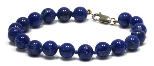 Accessorize with a splash of vibrant blue. This striking beaded bracelet features 8 millimeter rounds of lapis lazuli, with a rich, mottled royal blue color. Perfect with jeans and a crisp white blouse, this bracelet is also fancy enough to complement a more formal outfit. It has a length of 7 1/2 inches and fastens with a lobster claw clasp in 14 karat yellow gold.