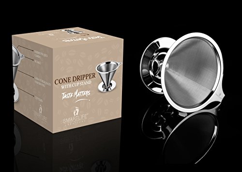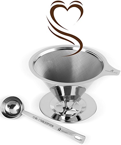 -. Title : Coffee Lover's Dream, Permanent Reusable Pour Over Coffee Dripper, Eco Friendly, BPA Free, 18/8 Stainless Steel, Pour Over Cone Dripper with Cup Stand, Complementary Measuring Spoon (Brews 4 Cups)