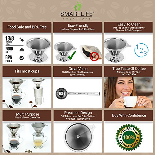 -. Feature : ✅ NO MORE PAPER FILTERS: The perfect alternative to disposable paper filters, which rob your coffee of essential oils and nutrients and leave paper taste in your coffee. Enjoy full flavored coffee with this Paperless Pour Over Coffee Filter. / ✅ PERFECT DESIGN: This Micro Dripper And Brewer is designed to fit on most cups, mugs, thermoses, small pots, and even carafes / ✅ PRECISION DESIGN: Laser cut 18/8 stainless steel double filter ensures that no grounds end up in your cup, really a clever coffee dripper. / ✅ EASY TO CLEAN: Reusable and easy to clean - simply rinse well with warm water or throw it into the dishwasher top Shelf. / ✅ MULTIPURPOSE: Brew a perfect cup of coffee or green tea.