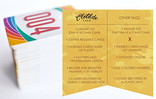 -. Binding : Kitchen -. Brand : Clotilde Tags -. EAN : 0643907990007 -. Feature : LARGER SIZE - These tags are the new and improved larger size measuring at 85 × 54 mm which is the exact size of a credit card, double the size of others! These larger size tags give perfect visibility of the numbers during live sales. Tags that are half this size are tiny and very difficult to see. In addition, our numbers are designed larger and more visible than on other tags. / 3 BONUS BLANK REUSABLE TAGS - In case of loss, these extra blank tags are a lifesaver. Write on them with a sharpie, or to reuse over and over again use a dry erase marker! / DURABLE TAGS MADE OF PLASTIC - These are durable and made to withstand reuse. The high quality P.R.Int will not rub off and is bright and clear. / BETTER AND BRIGHTER DESIGN - We have improved on the tags that have an outdated and dull design. These tags have a professional and commercial feel to them and are in line with branding of the clothing. / COMES DELIVERED IN STURDY PERFECTLY FITTED CARDBOARD BOX - Other companies ship their tags in a plastic bag that gets thrown out later. Our cardboard box was specifically sized for the tags to protect and hold the cards in place during shipment. The box is a good place to store the cards at the end of the day. -. IsAutographed : 0 -. Label : Clotilde Shop -. Manufacturer : Clotilde Shop -. PackageQuantity : 1 -. ProductGroup : Home -. ProductTypeName : HOME -. Publisher : Clotilde Shop -. Studio : Clotilde Shop -. Title : Live Sale Numbered Hanger Tags | LARGE SIZE with Reverse Mirror Image on the Back Side | 100 pieces (1-100) -. UPC : 643907990007