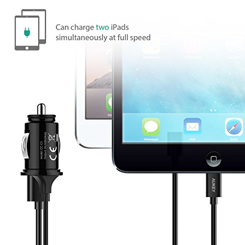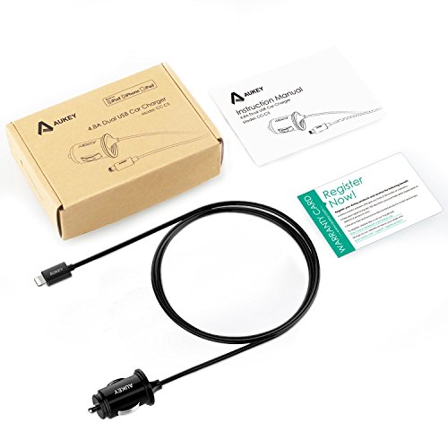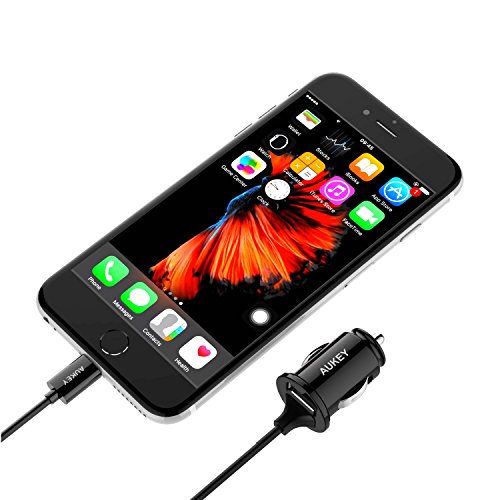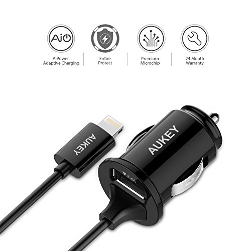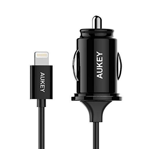 AUKEY Car Charger Attached with USB-A to MFI Lightning Cable & USB Port for iPhone 6S/6S Plus/5S, iPad & More