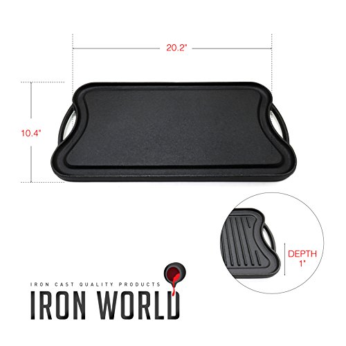 Our offer includes: 20"/10" Hand Made and Pre Seasoned Cast Iron Reversible Griddle, Iron World Chef Glove and a 28 page e-Book with mouth watering BBQ recipes.