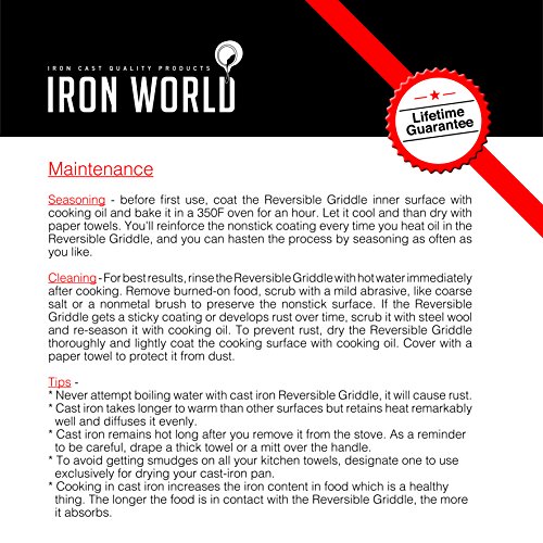 Simple and Easy Maintenance - Hand Wash, Dry, Rub with cooking oil and your Iron World Griddle will last forever.