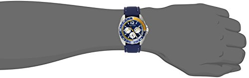 Sporty round watch featuring blue and yellow top ring and sunray dial with day, date, and 24-hour subdials