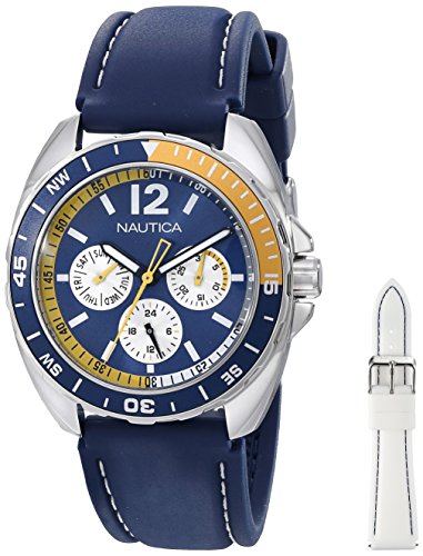 Sporty, interchangable multifunction watch. The white and navy resin straps create two different watches and allow you play in various water activities since the watch is water resistant to 330ft.