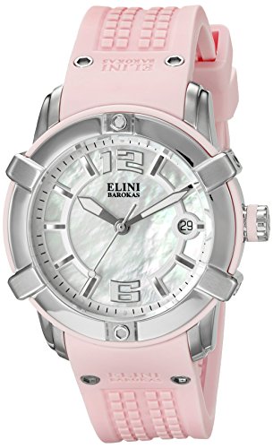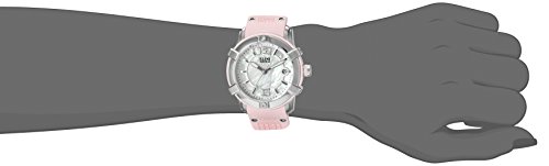 White mother of pearl dial with silver tone and white hands, hour markers and arabic numerals; luminous; screw-down crown; sapphitek crystal; stainless steel case; pink silicone strap