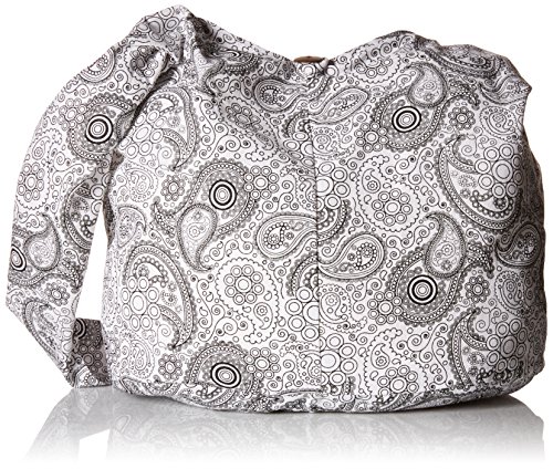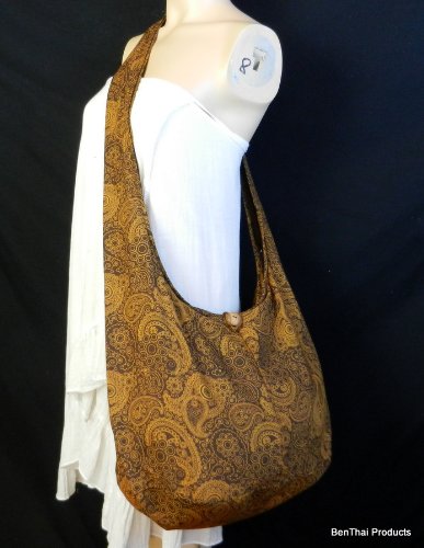 Truly a classic paisley print design, this roomy and durable bag is good for all day use, but has fashionable color to select from as well. Fully Lined with zippered main compartment along with a native wood button clasp, inside zippered pocket and a reinforced base that doesn't intrude on this roomy hobo. 100% cotton fabric construction. Size: Height 13" Length: 20" Depth: 9" Drop: 21" shoulder strapFeature