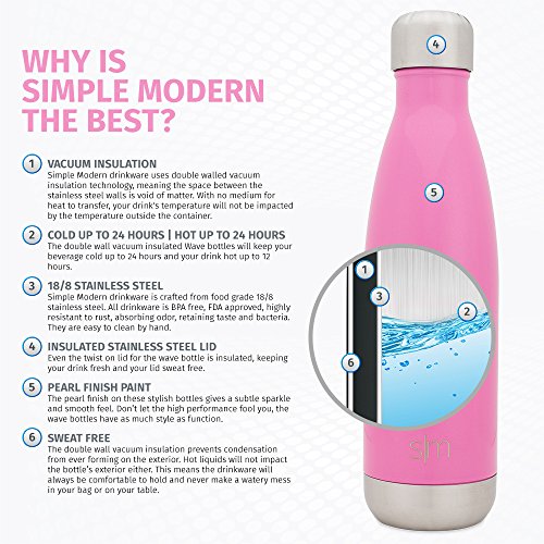 -. Binding : Misc. -. Brand : Simple Modern -. Feature : ✓ VACUUM INSULATED - The double walled vacuum insulated exterior will keep your drink the same temperature as long as science will allow. / ✓ SWEAT FREE - The exterior will never sweat. Don't worry about getting water on your desk, rings on your table, or a mess in your bag! The bottle won't even be hot or cold to the touch no matter the temperature of the liquid. / ✓ FITS MOST CUP HOLDERS - The shape of this 17oz bottle will fit normal sized cup holders and the narrow mouth makes it easy to drink from on the go. / ✓ DURABLE - Made from FDA approved 18/8 stainless steel, this cola shaped bottle is ready for everyday use. / ✓ STAY COOL - Not only will you be stylish with your choice of popular colors, your drink stay cold for 24 hours or hot for up to 12 hours. -. IsAutographed : 0 -. IsMemorabilia : 0 -. Label : Simple Modern -. Manufacturer : Simple Modern -. PackageQuantity : 1 -. ProductGroup : Sports -. ProductTypeName : SPORTING_GOODS -. Publisher : Simple Modern -. Studio : Simple Modern -. Title : Simple Modern Vacuum Insulated 17oz Wave Bottle - Double Walled Stainless Steel Water Thermos - Cola Style Hydro Swell Tumbler - Compare to S'well