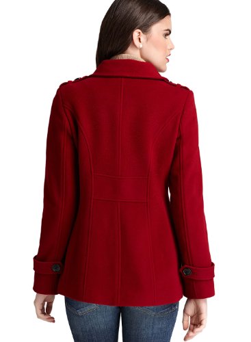 Short coat peacoat with standing collar. Full asymmetric zipper and button-through front closure, double-breasted, 2 front pockets, shoulder epaulets, 1 inside pocket, button tab cuffs. Fully lined for cold weather. Great new outerwear addition