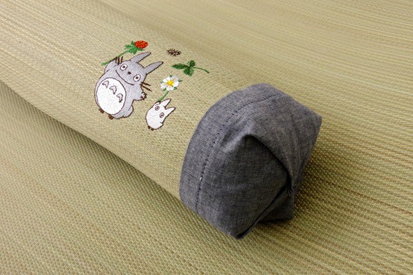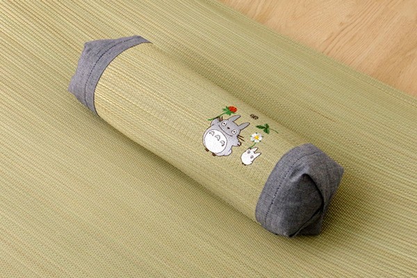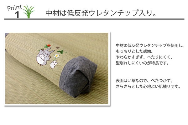 となりのトトロをあしらったイ草枕です。快眠い草の効能として1.綿の約2.5倍の吸湿力 2.蒸れにくい。汗による湿気を吸うことにより温度を下げ快適な就寝を促します。 3.汗のにおいを軽減。汗のにおいの元となる化学物質を90%以上抑えます。などがあります。国産(九州産)のしなやかなイ草を使用していますので、柔らかく、すべすべしたとした肌触りです。中材には低反発ウレタンチップを使用しています。ヘタリにくく、型崩れしやすいのが特長です。い草の表面に天然青森ヒバ加工を施しています(抗菌・防臭効果)。青森県のヒバの木から抽出した「ヒバ油」をメーカー独自の技術で材料や商品に加工しました。「ヒバ油」には、ヒノキチオールという天然物質としては極めて抗菌性の高い成分が含まれ、医療や食品など多分野で利用研究が進められています。