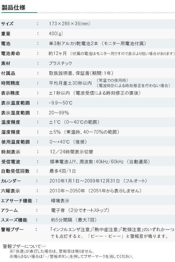 | 時刻を自動で修正する電波時計です。温度と湿度のバランスからお部屋の環境を画面に表示する「エアサーチ機能」付きで、注意マークが一つでも点灯するとブザーでお知らせしてくれます。設置場所に困らない置掛両用!! |